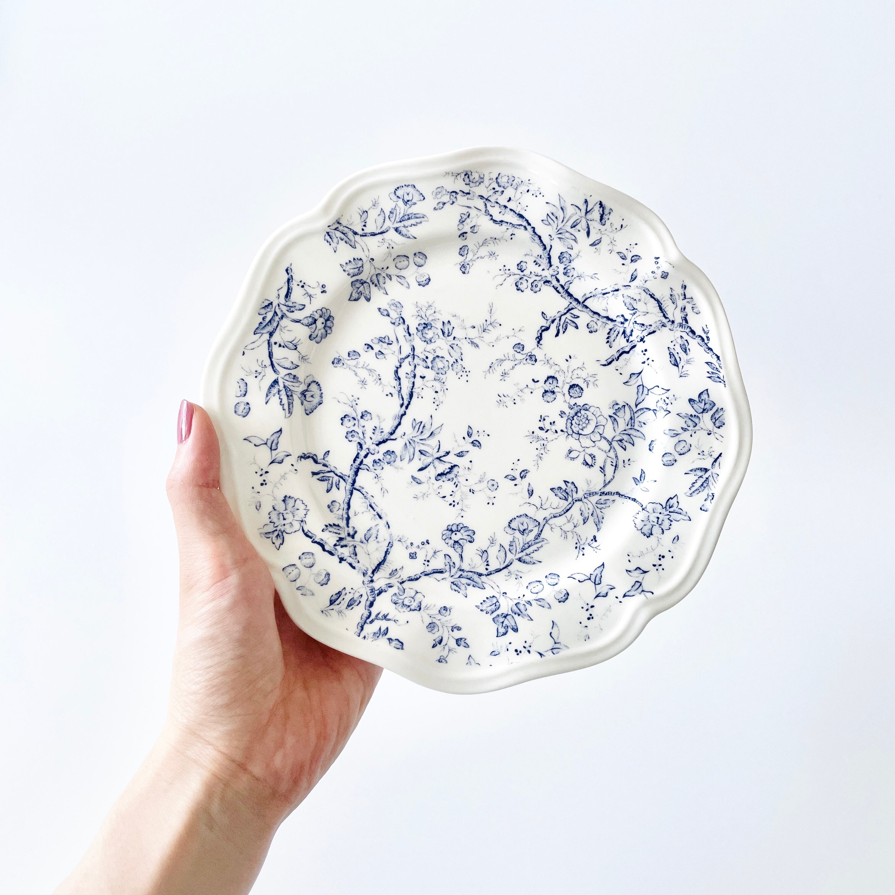 フランスのアンティーク風デザインのデザートプレート。上品な絵柄は手書きではなく転写加工によるものです。アンティークな雰囲気を楽しみつつ、気負いなく、扱いやすい1枚です。