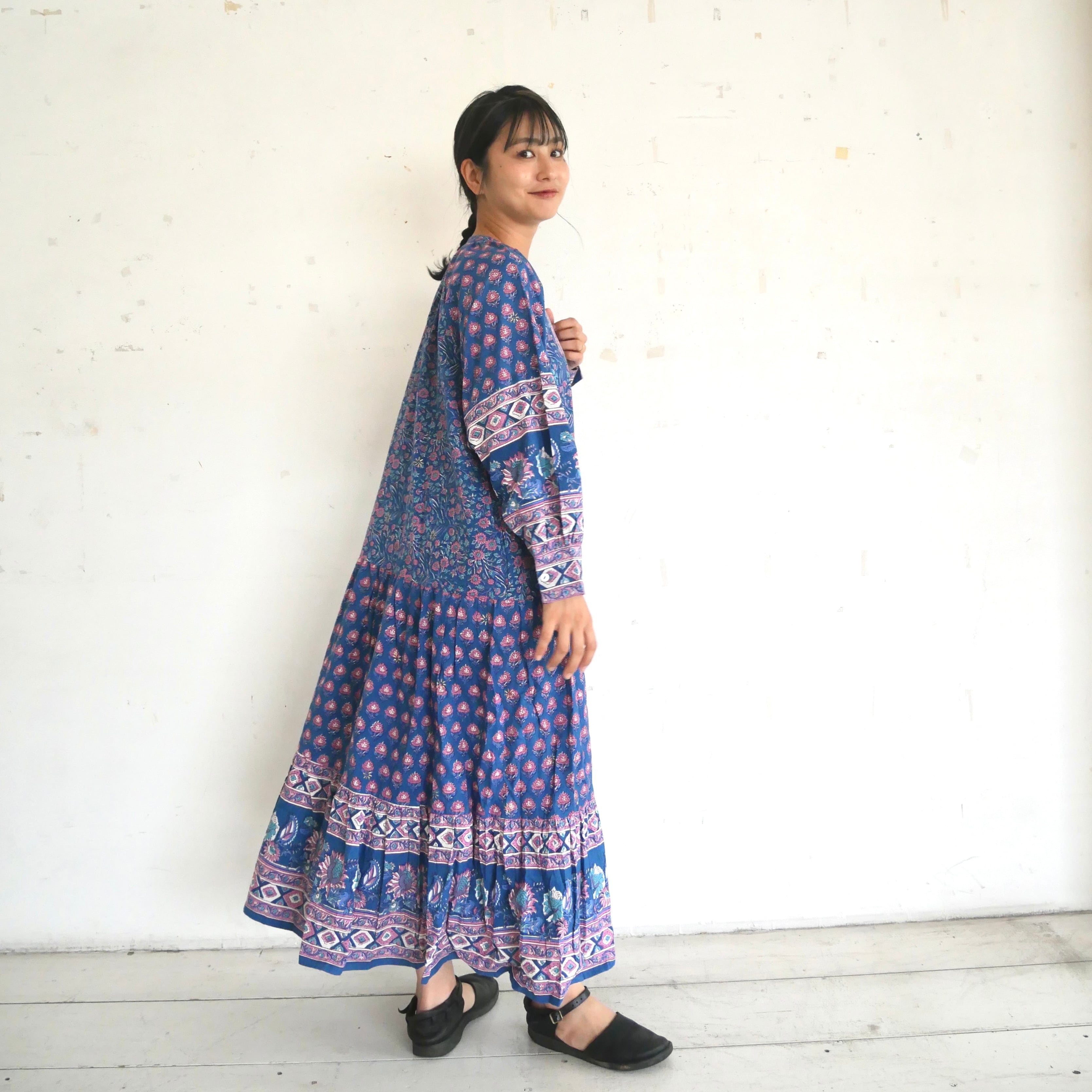 3種のブロック風プリントの上にさりげなく箔プリントを手押ししました。たっぷりとした生地に3種類のブロック風プリントと、さりげなく散りばめられた箔プリントが贅沢なワンピース。嬉しいサイドポケット付。